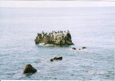 岩場にうみうが沢山羽を休めていました。海岸線はとてものどやかでした。また、後方の山には雪が、、、。